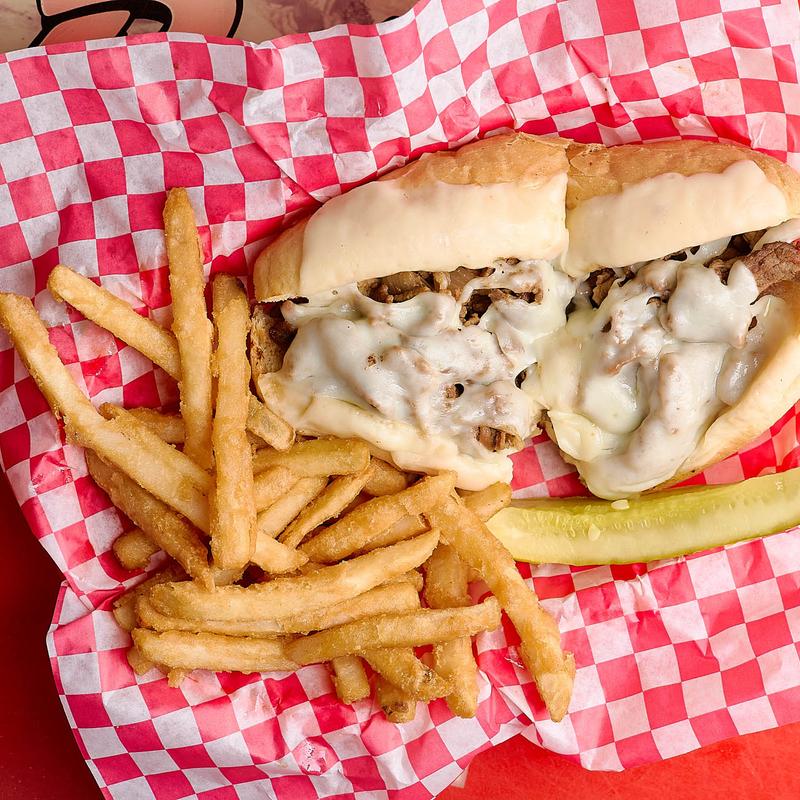 Served with A Side 11 oz. of Fresh Ground Beef topped with Grilled Onions, Mushrooms, and Melted Provolone Cheese. All on a bed of rice, side of greek salad, and breadsticks.